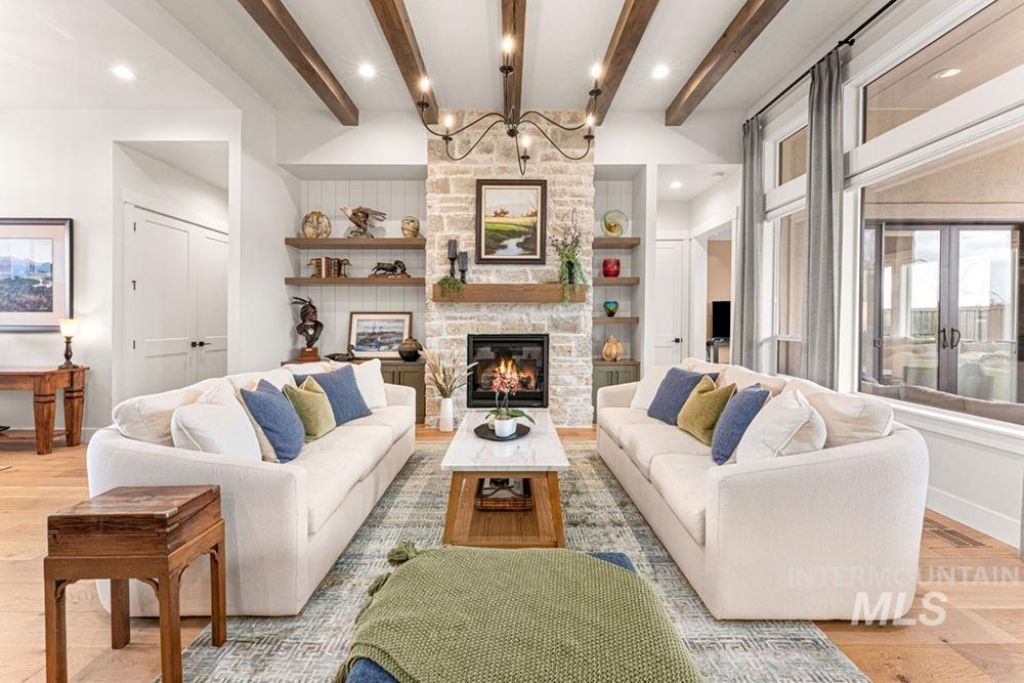A refined blend of timeless architecture & elevated modern design, this exceptional single-level residence offers a lifestyle as beautiful as the home itself. Perfectly positioned in Eagles desirable Homestead subdivision with no rear neighbors, the home showcases thoughtful spaces, extensive upgrades, & seamless indoor-outdoor living. Wide-plank hardwood floors lead into a stunning great room with soaring 12 beamed ceilings, expansive windows, & floor-to-ceiling stone fireplace. The showpiece kitchen is designed for both daily living & entertaining, featuring Thermador Professional appliances, a 6-burner gas range, rich wood cabinetry, matte quartz countertops, a large island, and a butlers pantry with second oven, dishwasher, and sink. A private office, light-filled bonus room with patio access, and split-bedroom layout add flexibility and comfort. The serene primary suite offers tray ceilings with wood beam detail and a spa-like bath with soaking tub, frameless walk-in shower, designer finishes, and a custom closet with direct laundry access. Outdoors, professionally designed landscaping surrounds a tranquil water feature, flagstone paths, raised irrigated garden beds, and a covered patio with built-in grill and refrigerator. Epoxy-finished 3-car garage with custom cabinetry. Close to community pools, parks, playgrounds, & walking paths.